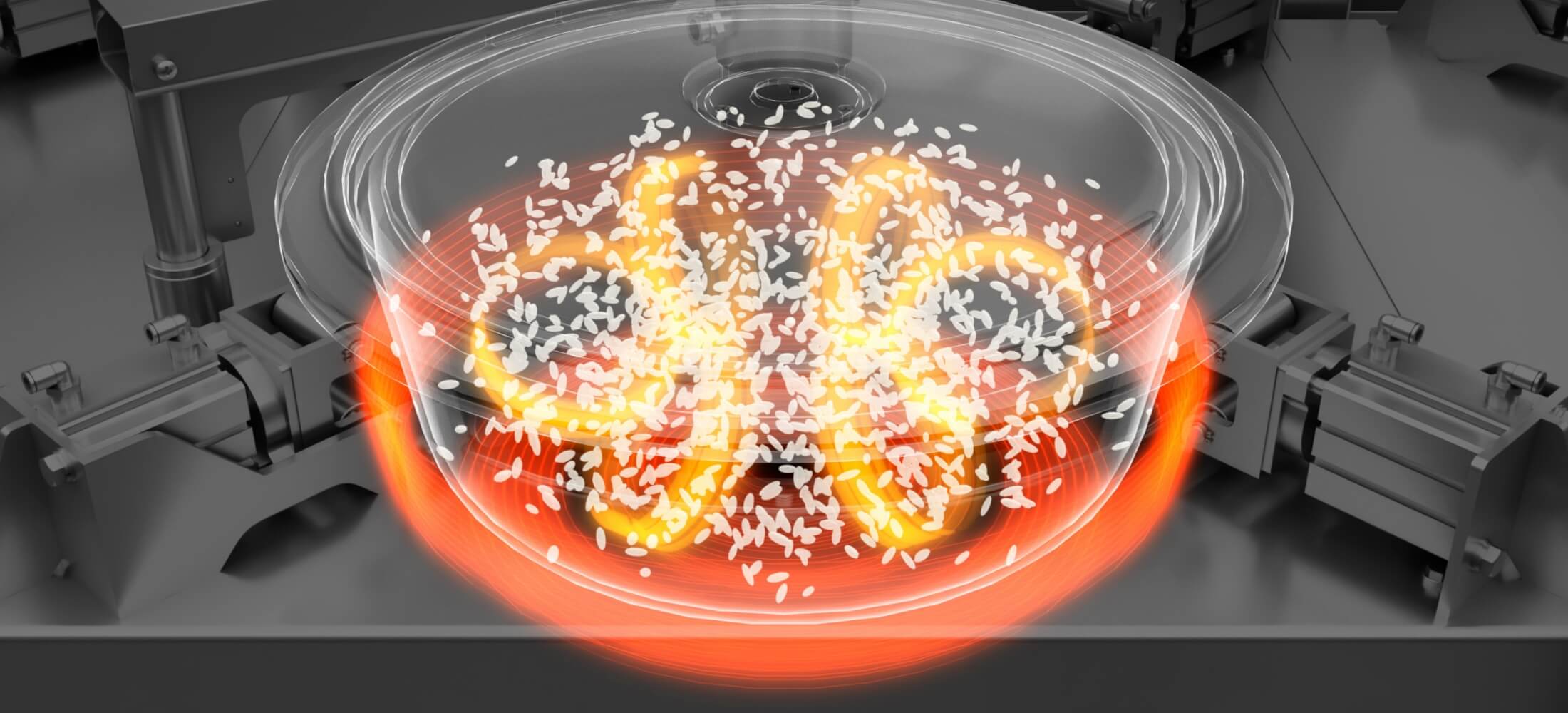 釜内加压至1.2大气压,以106℃釜内温度进行煮饭。热量传递至米粒中心,煮出粒粒分明、饱满润泽的米饭。