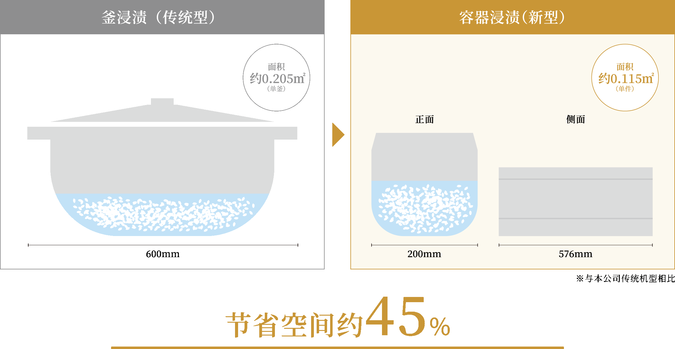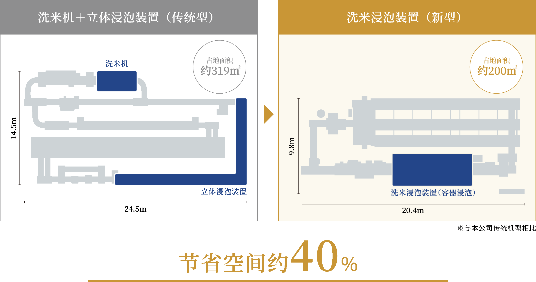 通过佐竹独有的制造工艺(容器浸泡法),可实现紧凑的设计与布局。相比传统工艺,可节省约25%至40%的空间。